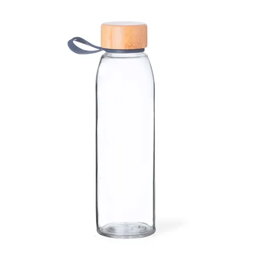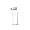 Bidon en verre de 500 ml. Bouchon à vis en bambou avec poignée en silicone pratique. Présenté dans une boîte design kraft.