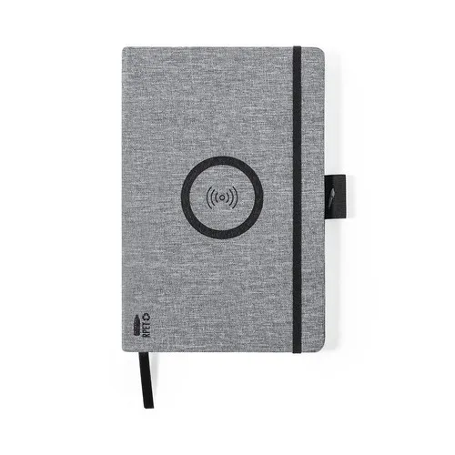 Bloc note chargeur de la ligne nature en polyester résistant 300D RPET de taille A5 et fabriqué à partir de plastique recyclé, afin de promouvoir la réutilisation des déchets plastiques et de contribuer à la durabilité de la planète. Avec chargeur sans fil 10W intégré dans la couvertur. Comprend 80 feuilles lignées. Compatible avec les smartphones dotés de la technologie de charge sans fil. Câble de charge de type C et le manuel d’instructions disponibles en espagnol et en anglais inclus.