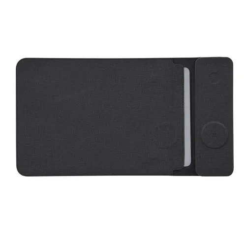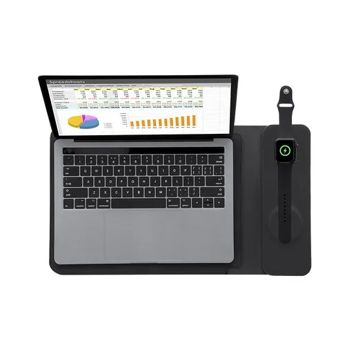 Housse dordinateur portable multifonction en PU Recyclé et tissu RPET. Convient aux ordinateurs jusquà 13 pouces et équipée dun système de charge sans fil multifonction. Comprend 2 chargeurs : chargeur sans fil magnétique pour montre connectée, situé en haut, et chargeur sans fil magnétique pour mobile et/ou écouteurs en bas. Avec système de fermeture magnétique. Chargeur Sans Fil 15W
