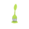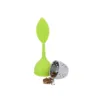 Infuseur à thé en forme de feuille, fabriqué en silicone et en acier inoxydable. Inclut une base en silicone.