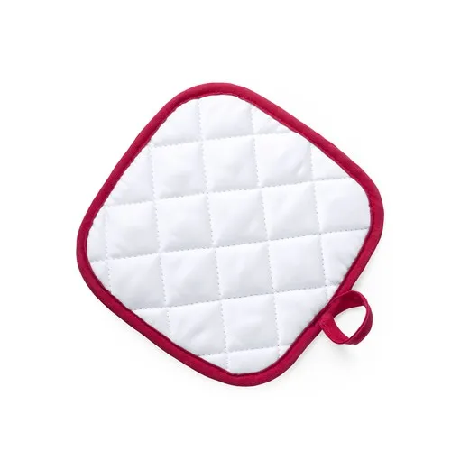 Manique de cuisine en 100% polyester doux, blanche avec liserés aux couleurs vives. Avec une face lisse spécialement prévue pour la sublimation. Cordon d´accroche. Un Côté Lisse pour Impression