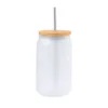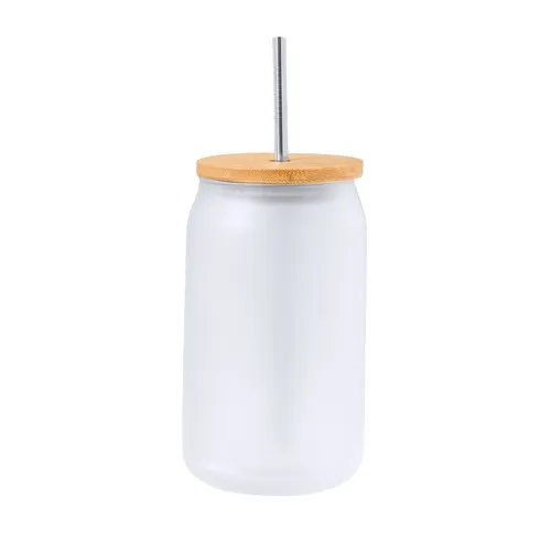 Pot de sublimation avec corps en verre mat résistant, avec une capacité de 400ml. Couvercle en bambou à pression avec trou pour paille (paille incluse et fabriquée en acier inox). Spécialement conçue pour le marquage par sublimation. Présentée en boîte individuelle kraft. 400 ml