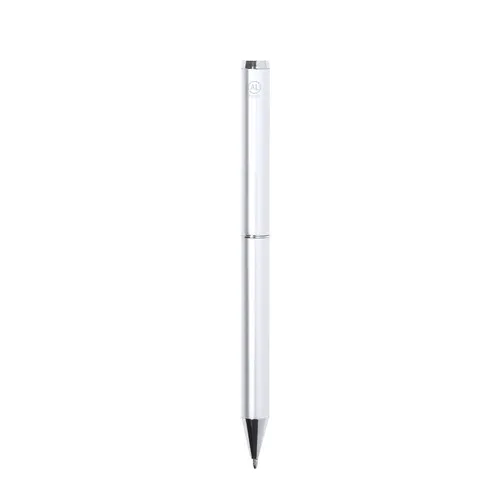 Set de stylo et roller en aluminium recyclé. Stylo à capuche à mécanisme rotatif et roller, tous deux équipés d’un clip métallique. Tous deux sont marqués à l’encre bleue et présentent un corps de finition brillant, avec une marque en aluminium recyclé. Présentés dans une boîte individuelle kraft. L’aluminium recyclé est un matériau avec des possibilités de recyclage presque infinies, sans perdre ses propriétés d’origine et consommant moins d’énergie dans ce processus.Certification GRS (Global Recycled Standard / Standard de Recyclage Global), qui garantit l’origine recyclée des matériaux utilisés pour fabriquer le produit. Stylo et Roller. Recharge Jumbo