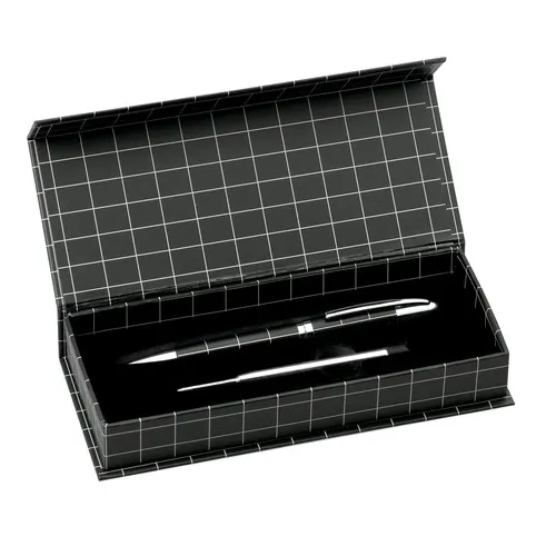 Elégant stylo à mécanisme tournant au design sobre.Corps métallique avec attributs coloris argent. Présenté dans un élégant étui individuel noir avec fermeture aimantée. Cartouche Jumbo avec recharge incluse. Encre bleue.