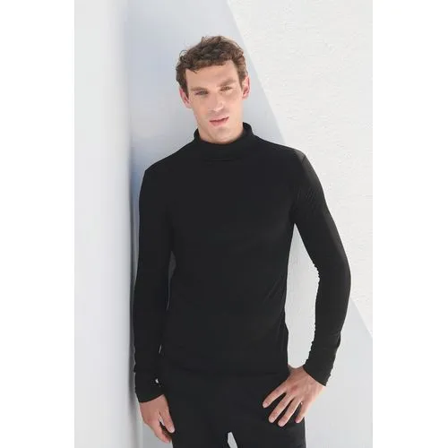 Coupe tubulaire. Coupe droite. Encolure ronde en bord-côte avec double surpiqûres à cheval de la couture. Bande de propreté ton sur ton à l’encolure.